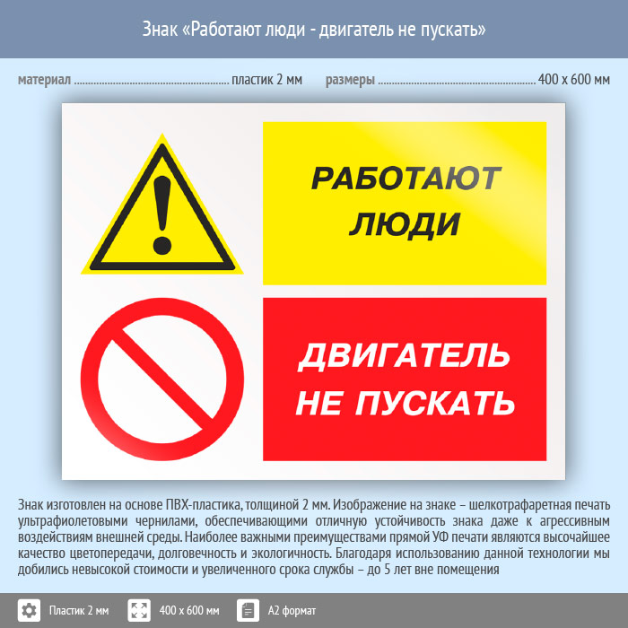 Знак «Работают люди - двигатель не пускать», КЗ-82 (пластик, 600х400 мм) в Москве купить