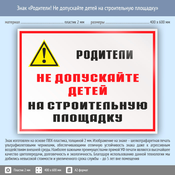 Знак «Родители! Не допускайте детей на строительную площадку», КЗ-84 (пластик, 600х400 мм) в Москве купить