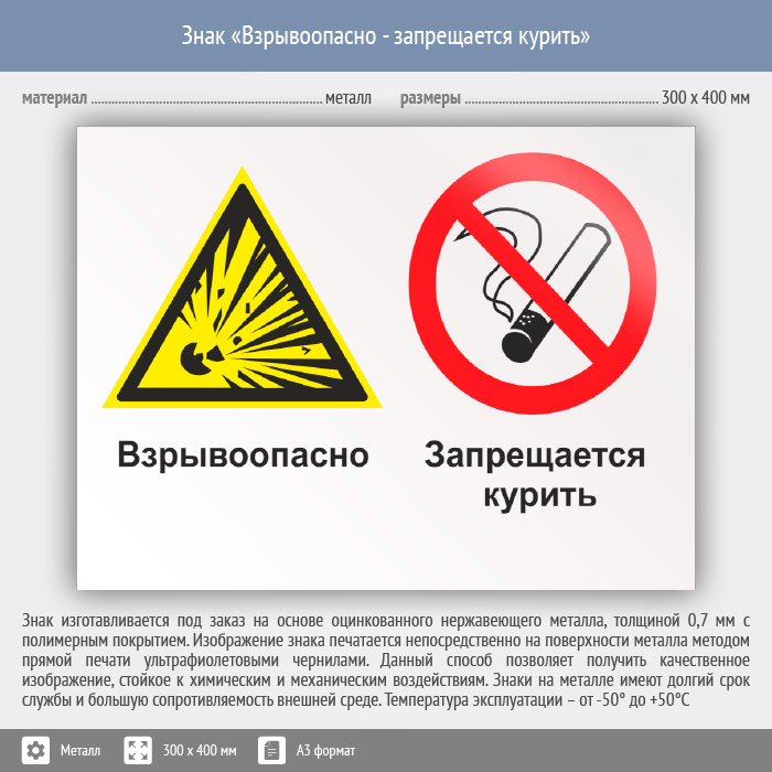 Знак «Взрывоопасно - запрещается курить», КЗ-06 (металл, 400х300 мм) в Москве купить