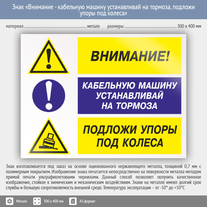 Знак «Внимание - кабельную машину устанавливай на тормоза, подложи упоры под колеса», КЗ-12 (металл, 400х300 мм) в Москве купить