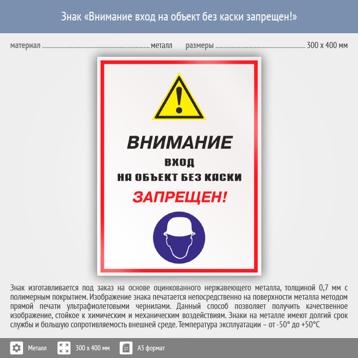 Знак «Внимание вход на объект без каски запрещен!», КЗ-13 (металл, 300х400 мм) в Москве купить
