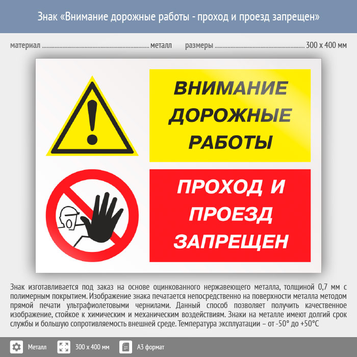 Знак «Внимание дорожные работы - проход и проезд запрещен», КЗ-14 (металл, 400х300 мм) в Москве купить