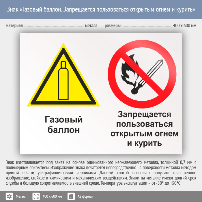 Знак «Газовый баллон. Запрещается пользоваться открытым огнем и курить», КЗ-19 (металл, 600х400 мм) в Москве купить