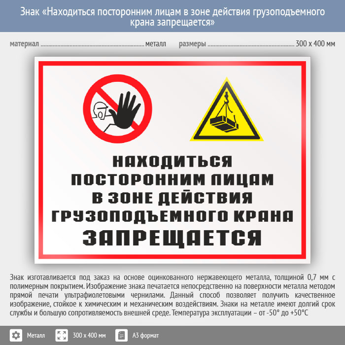 Знак «Находиться посторонним лицам в зоне действия грузоподъемного крана запрещается», КЗ-23 (металл, 400х300 мм) в Москве купить