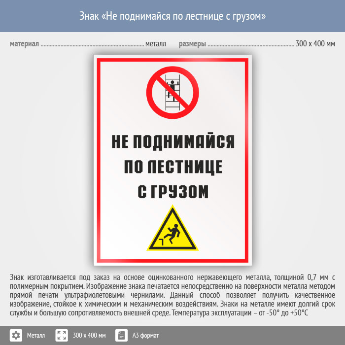 Знак «Не поднимайся по лестнице с грузом», КЗ-28 (металл, 300х400 мм) в Москве купить