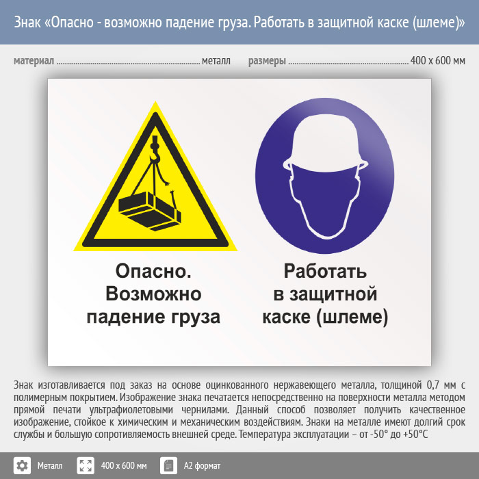 Знак «Опасно - возможно падение груза. Работать в защитной каске (шлеме)», КЗ-34 (металл, 600х400 мм) в Москве купить