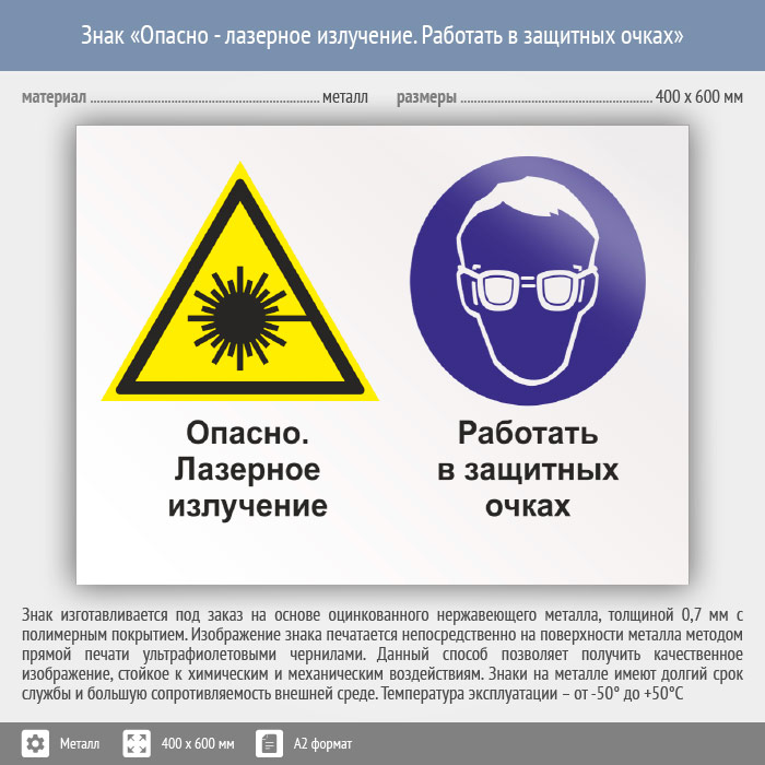 Знак «Опасно - лазерное излучение. Работать в защитных очках», КЗ-38 (металл, 600х400 мм) в Москве купить