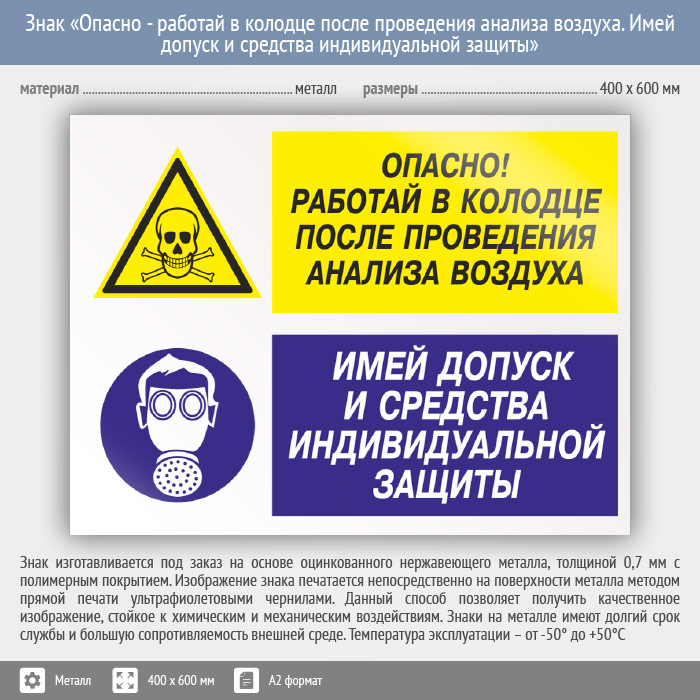 Знак «Опасно - работай в колодце после проведения анализа воздуха. Имей допуск и средства индивидуальной защиты», КЗ-40 (металл, 600х400 мм) в Москве купить