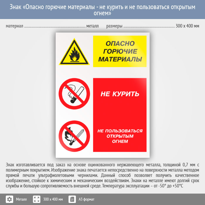 Знак «Опасно горючие материалы - не курить и не пользоваться открытым огнем», КЗ-45 (металл, 300х400 мм) в Москве купить