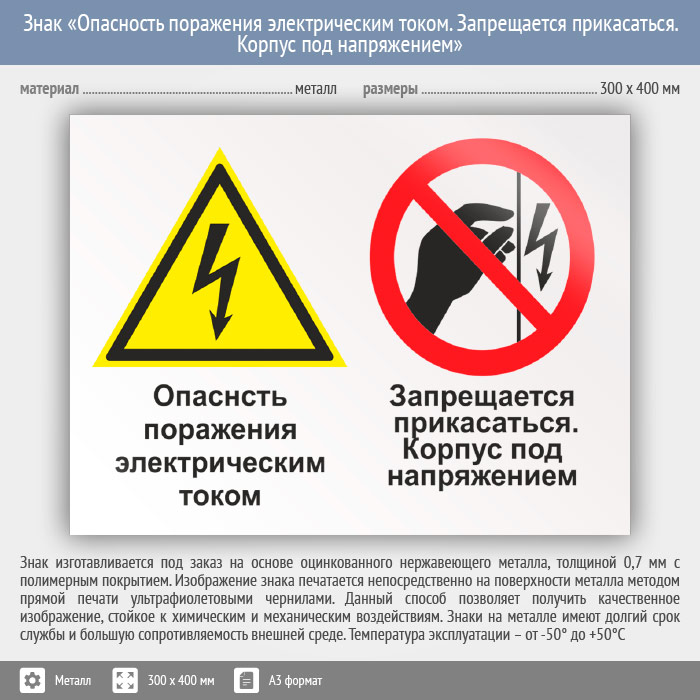 Знак «Опасность поражения электрическим током. Запрещается прикасаться. Корпус под напряжением», КЗ-47 (металл, 400х300 мм) в Москве купить