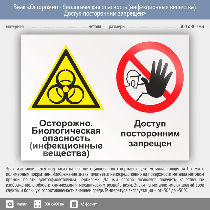Знак «Осторожно - биологическая опасность (инфекционные вещества). Доступ посторонним запрещен», КЗ-51 (металл, 400х300 мм) в Москве купить