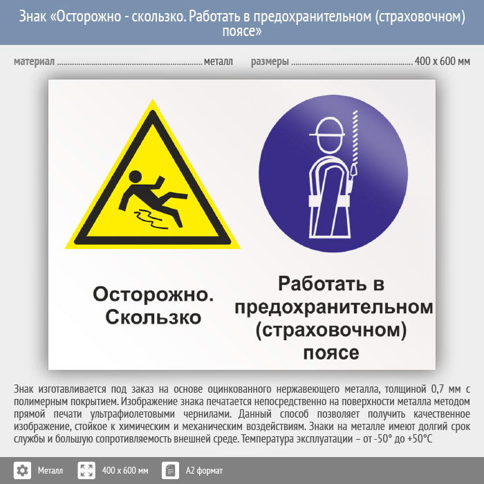 Знак «Осторожно - скользко. Работать в предохранительном (страховочном) поясе», КЗ-58 (металл, 600х400 мм) в Москве купить