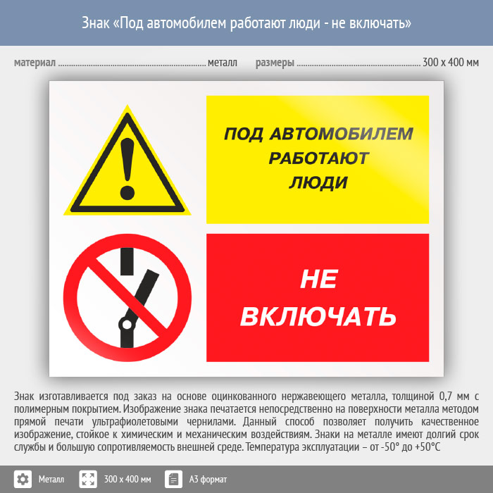 Знак «Под автомобилем работают люди - не включать», КЗ-65 (металл, 400х300 мм) в Москве купить