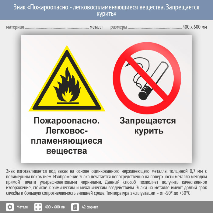 Знак «Пожароопасно - легковоспламеняющиеся вещества. Запрещается курить», КЗ-69 (металл, 600х400 мм) в Москве купить