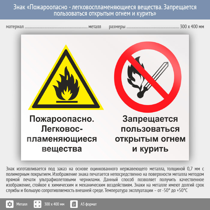 Знак «Пожароопасно - легковоспламеняющиеся вещества. Запрещается пользоваться открытым огнем и курить», КЗ-70 (металл, 400х300 мм) в Москве купить