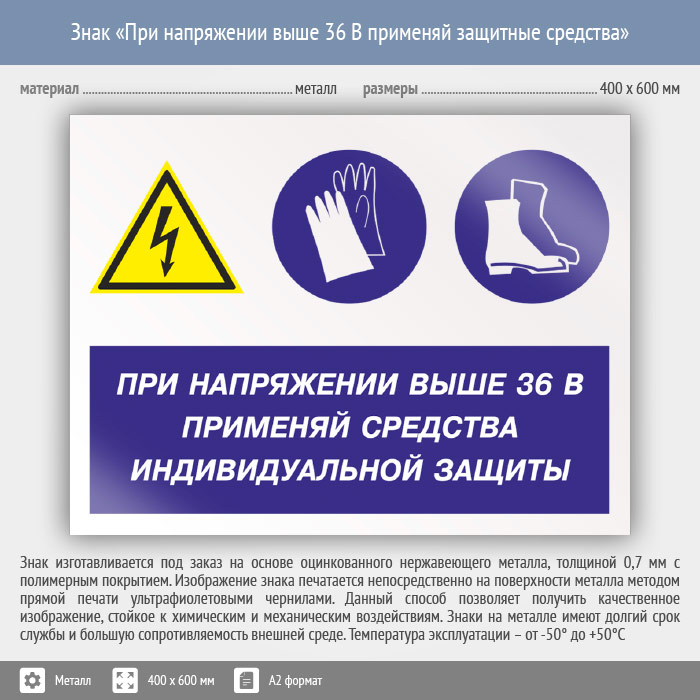 Знак «При напряжении выше 36 В применяй защитные средства», КЗ-71 (металл, 600х400 мм) в Москве купить