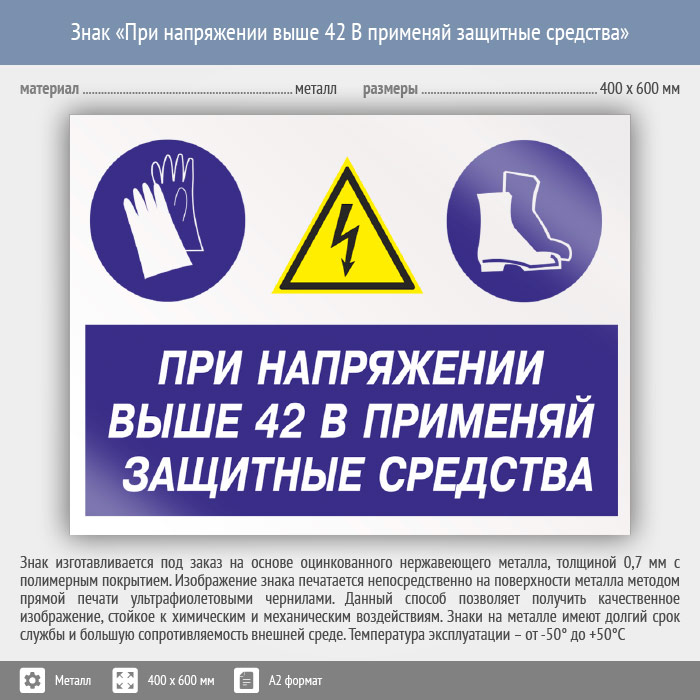 Знак «При напряжении выше 42 В применяй защитные средства», КЗ-72 (металл, 600х400 мм) в Москве купить