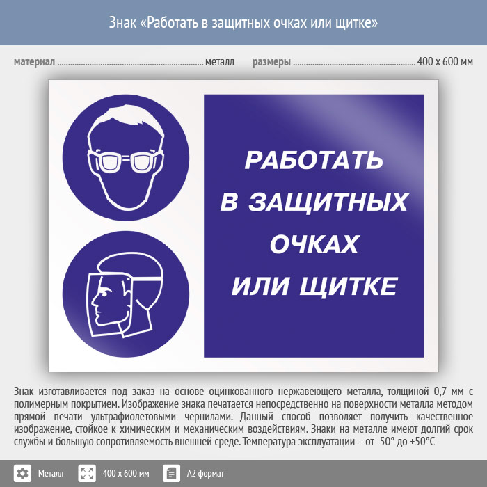 Знак «Работать в защитных очках или щитке», КЗ-80 (металл, 600х400 мм) в Москве купить
