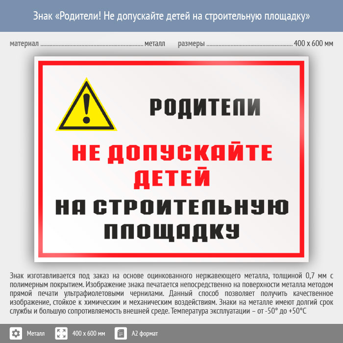 Знак «Родители! Не допускайте детей на строительную площадку», КЗ-84 (металл, 600х400 мм) в Москве купить