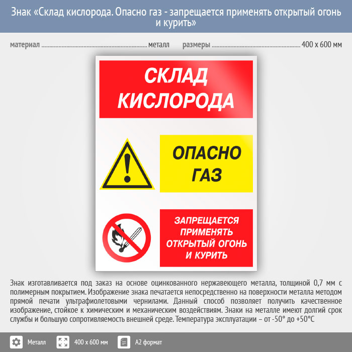 Знак «Склад кислорода. Опасно газ - запрещается применять открытый огонь и курить», КЗ-85 (металл, 400х600 мм) в Москве купить
