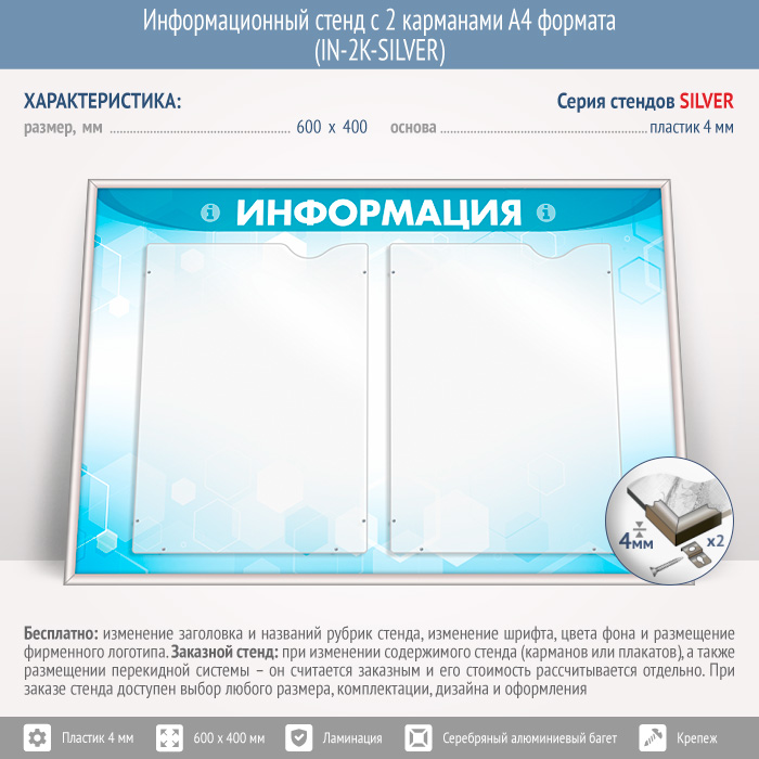 Информационный стенд с 2 карманами А4 формата (IN-2K-SILVER) в Москве купить
