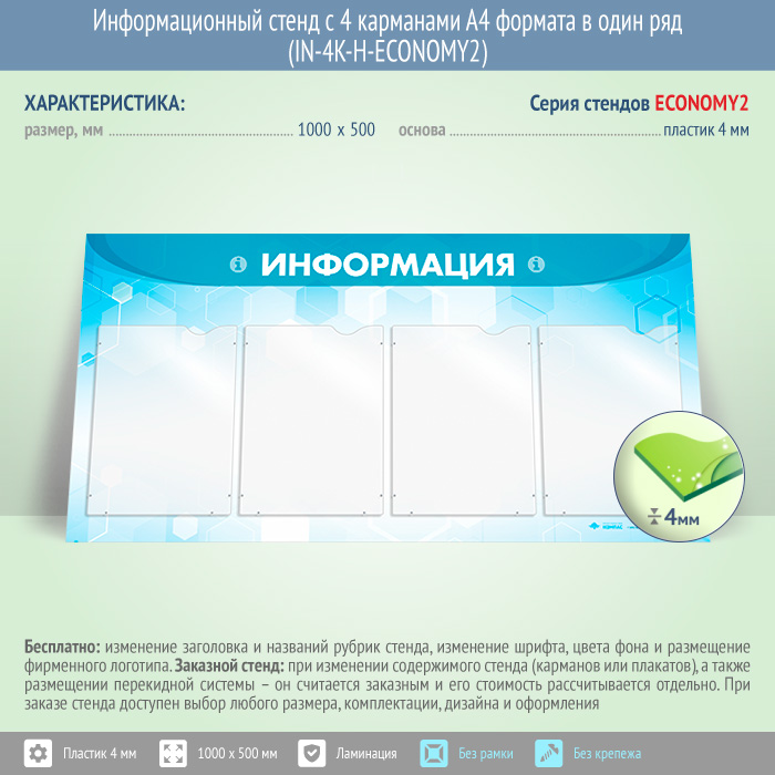Информационный стенд с 4 карманами А4 формата в один ряд (IN-4K-H-ECONOMY2) в Москве купить