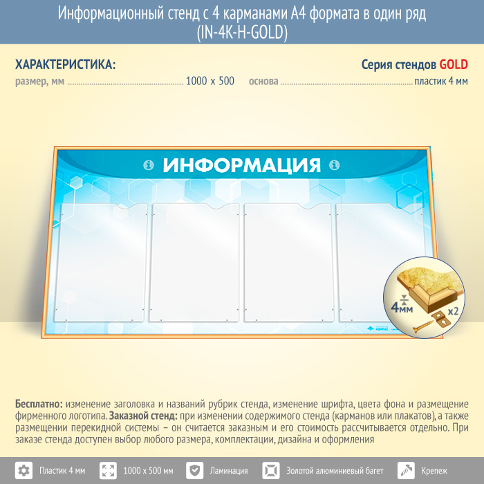 Информационный стенд с 4 карманами А4 формата в один ряд (IN-4K-H-GOLD) в Москве купить