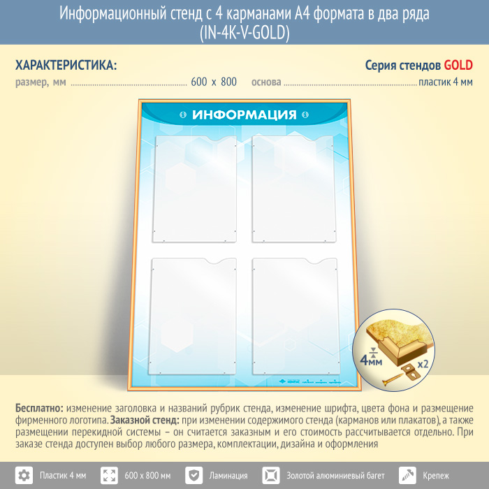 Информационный стенд с 4 карманами А4 формата в два ряда (IN-4K-V-GOLD) в Москве купить