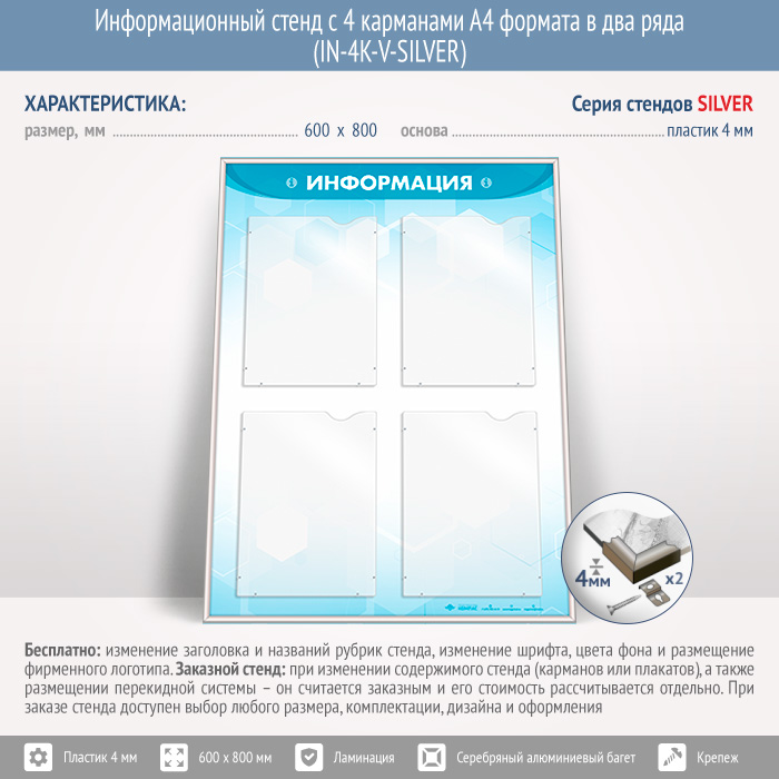 Информационный стенд с 4 карманами А4 формата в два ряда (IN-4K-V-SILVER) в Москве купить