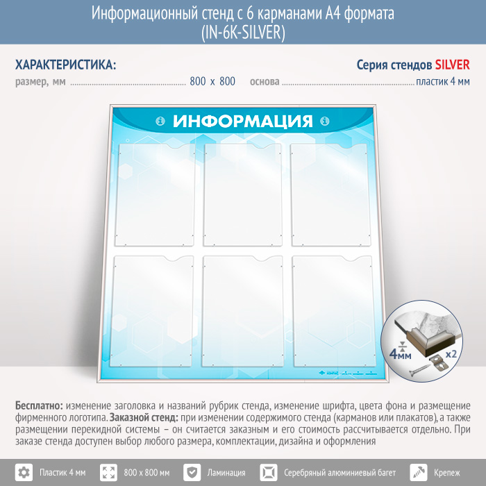 Информационный стенд с 6 карманами А4 формата (IN-6K-SILVER) в Москве купить