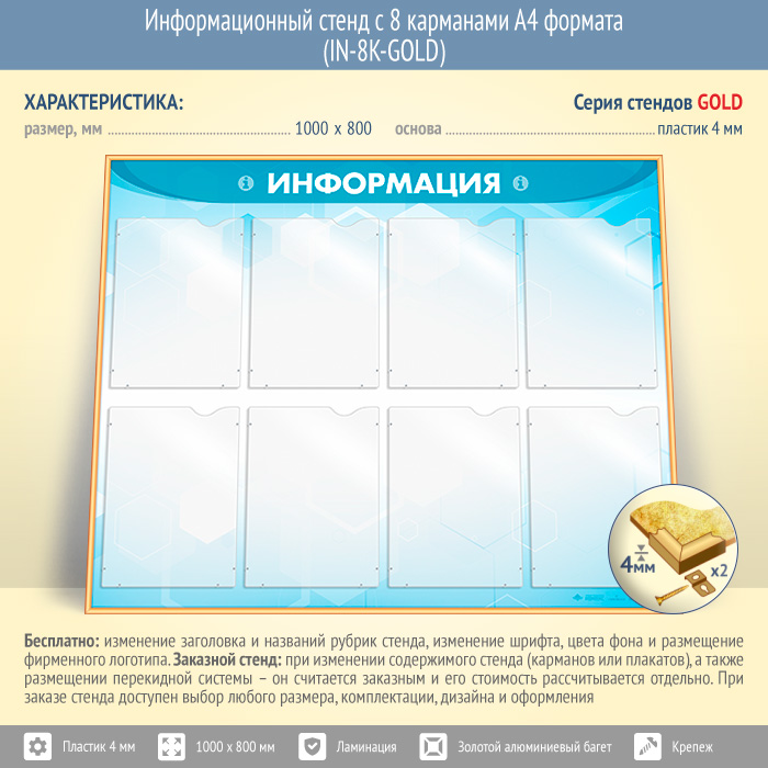 Информационный стенд с 8 карманами А4 формата (IN-8K-GOLD) в Москве купить