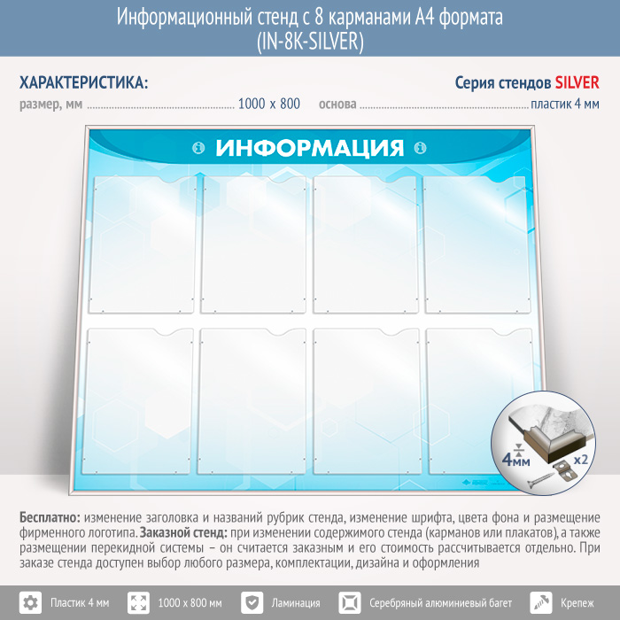 Информационный стенд с 8 карманами А4 формата (IN-8K-SILVER) в Москве купить
