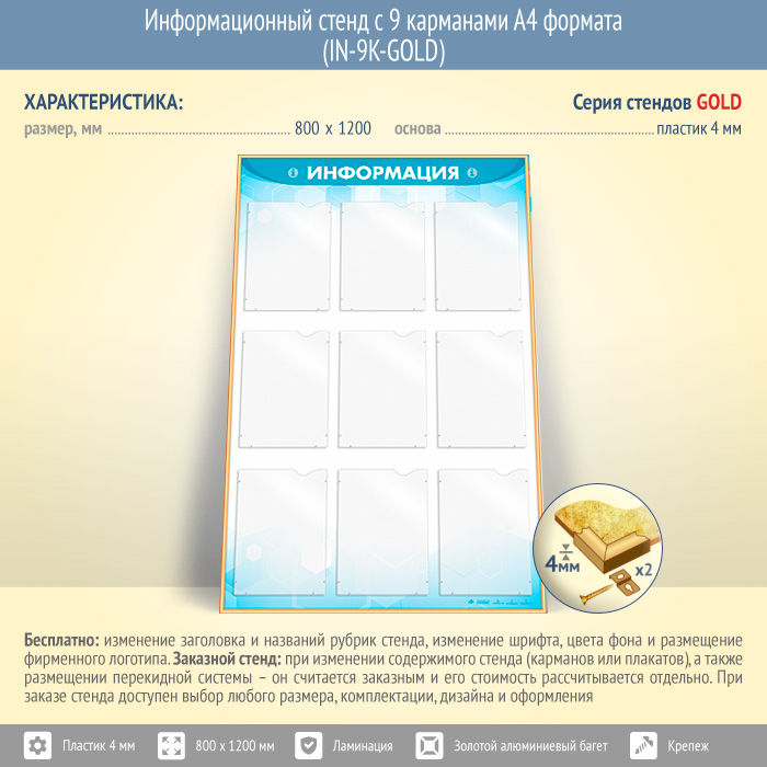 Информационный стенд с 9 карманами А4 формата (IN-9K-GOLD) в Москве купить