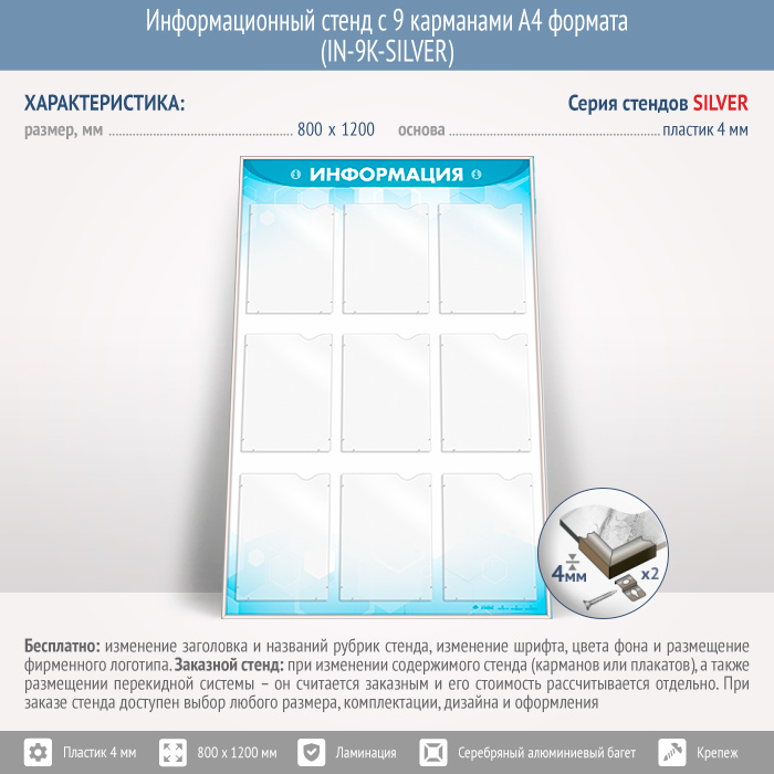 Информационный стенд с 9 карманами А4 формата (IN-9K-SILVER) в Москве купить