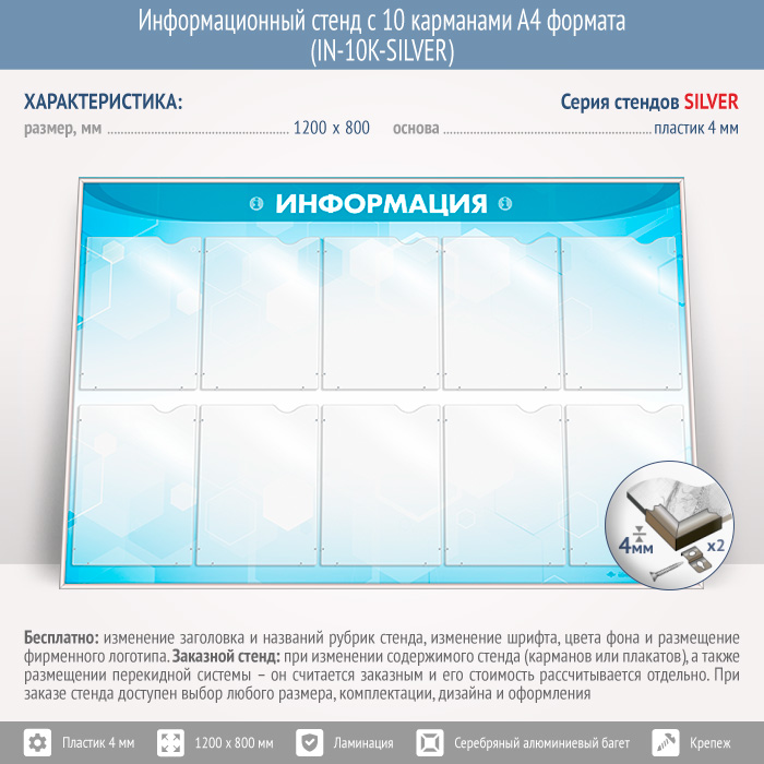Информационный стенд с 10 карманами А4 формата (IN-10K-SILVER) в Москве купить