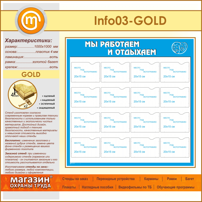 Стенд «Мы работаем и отдыхаем» с 16 карманами А5 формата (IN-03-GOLD) в Москве купить