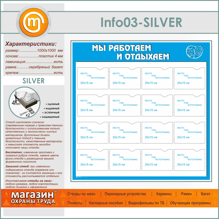 Стенд «Мы работаем и отдыхаем» с 16 карманами А5 формата (IN-03-SILVER) в Москве купить