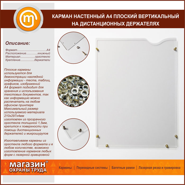 Карман настенный А4 плоский вертикальный на дистанционных держателях в Москве купить