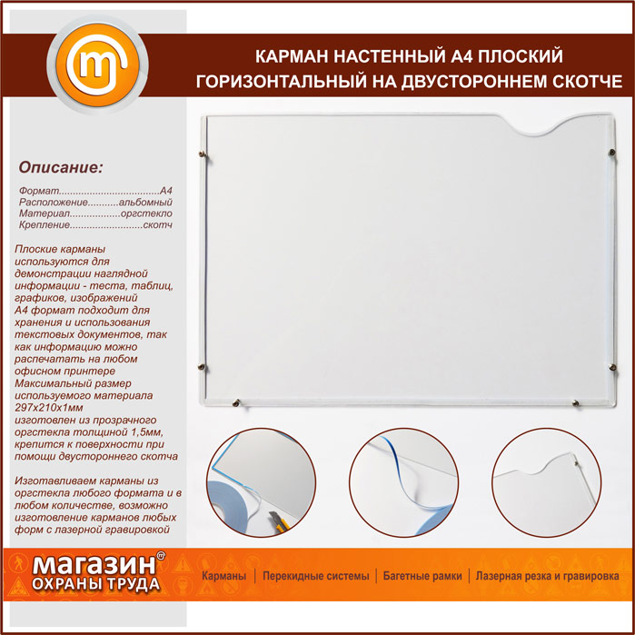 Карман настенный А4 плоский горизонтальный на двустороннем скотче в Москве купить