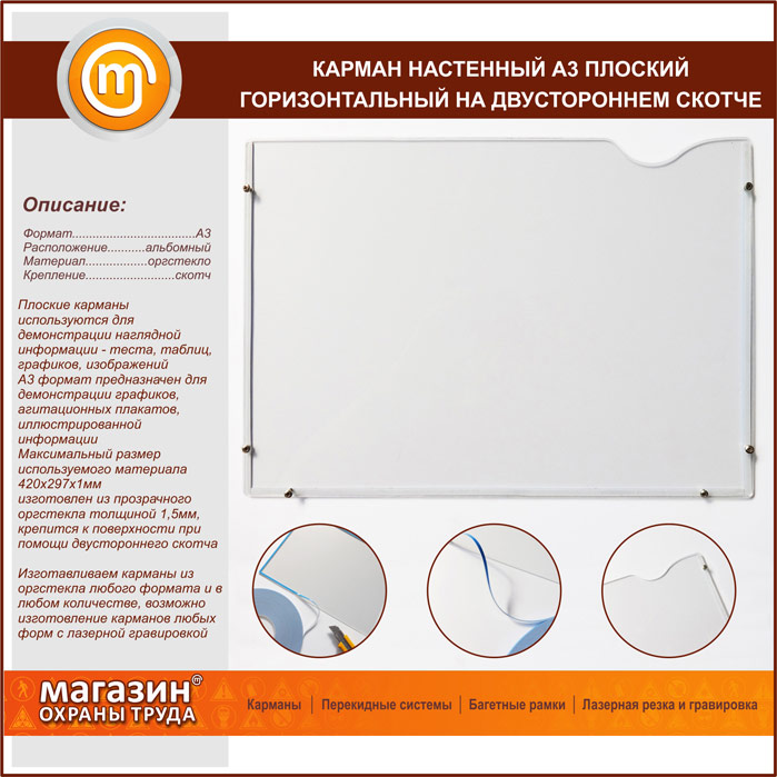 Карман настенный А3 плоский горизонтальный на двустороннем скотче в Москве купить