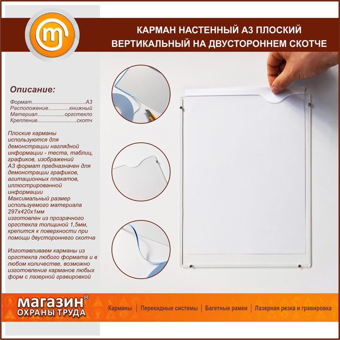 Карман настенный А3 плоский вертикальный на двустороннем скотче в Москве купить
