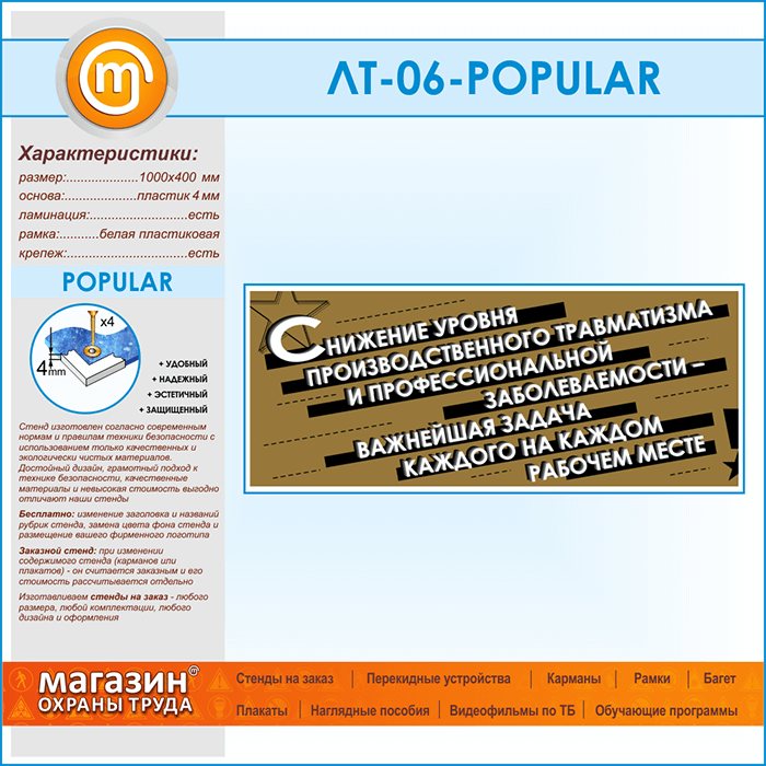 Предлагаем Вашему вниманию стенд с лозунгом «Снижение уровня производственного травматизма и профессиональной заболеваемости – важнейшая задача каждого на каждом рабочем месте»