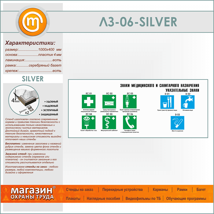 Стенд «Знаки медицинского и санитарного назначения. Указательные знаки» (LZ-06-SILVER) в Москве купить