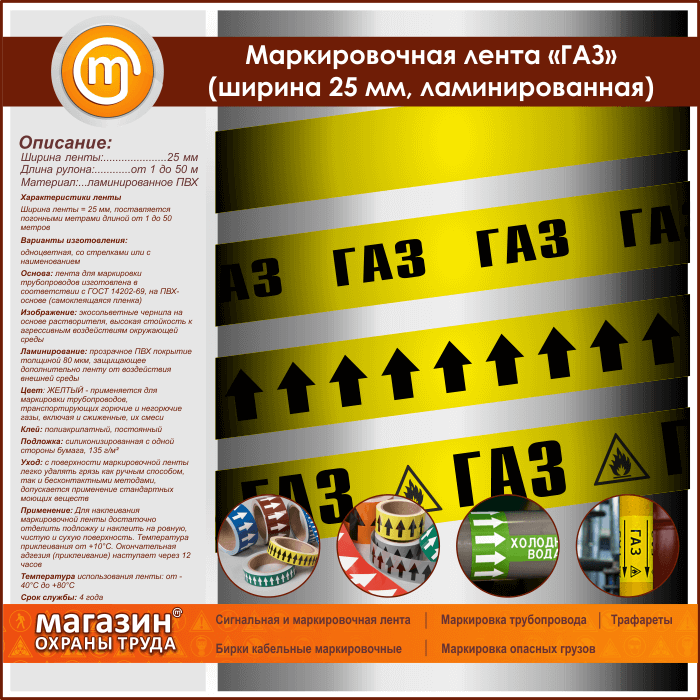 Маркировочная самоклеящаяся лента «ГАЗ» имеет ЖЕЛТЫЙ цвет и применяется для маркировки трубопроводов, транспортирующих горючие и негорючие газы, включая и сжиженные, а также их смеси. Поставляется погонными метрами длиной от 1 до 50 метров. Изготавливается одноцветной, со стрелками или с наименованием