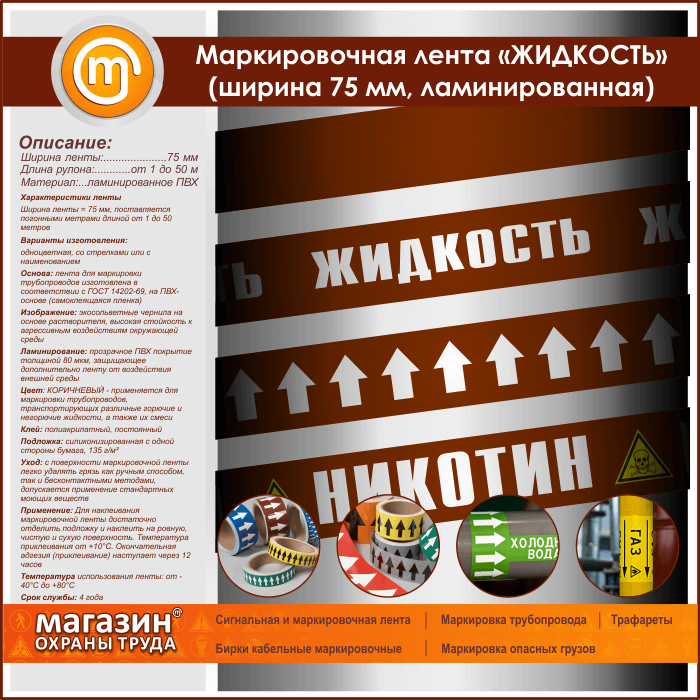 Маркировочная лента «ЖИДКОСТЬ» (ширина 75 мм, самоклеящаяся плёнка с ламинированием) в Москве купить