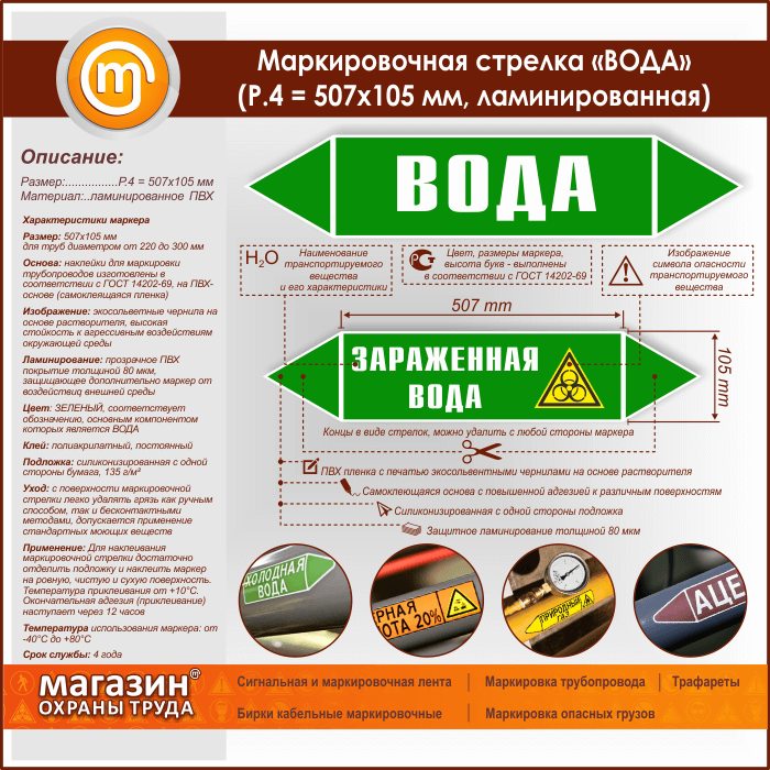 Маркировочная стрелка «ВОДА» (P.4 = 507х105 мм, самоклеящаяся плёнка с ламинированием) в Москве купить