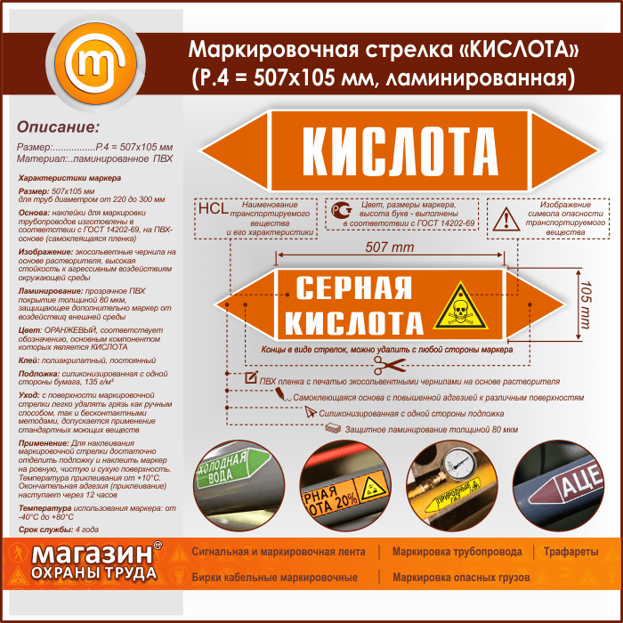 Маркировочная стрелка «КИСЛОТА» (P.4 = 507х105 мм, самоклеящаяся плёнка с ламинированием) в Москве купить