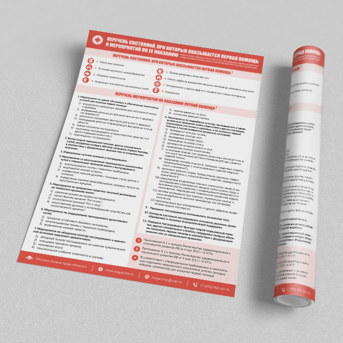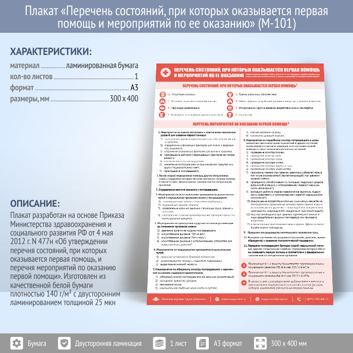 Плакат «Перечень состояний, при которых оказывается первая помощь и мероприятий по ее оказанию» (на основе Приказа от 04.05.2012 N 477н) (М-101, ламинированная бумага, А3, 1 лист) в Москве купить