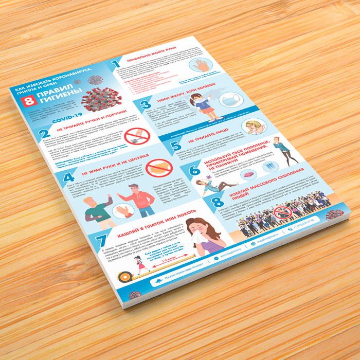 Плакат «Восемь правил гигиены. Как избежать коронавируса, гриппа и ОРВИ» (М-28, ламинированная бумага, А3, 1 лист) в Москве купить