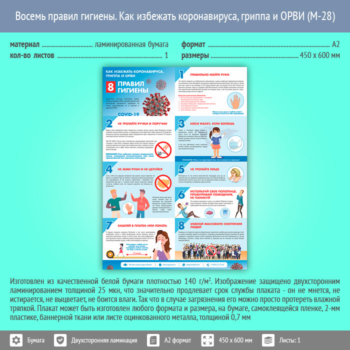 Плакат «Восемь правил гигиены. Как избежать коронавируса, гриппа и ОРВИ» (М-28, ламинированная бумага, А2, 1 лист) в Москве купить
